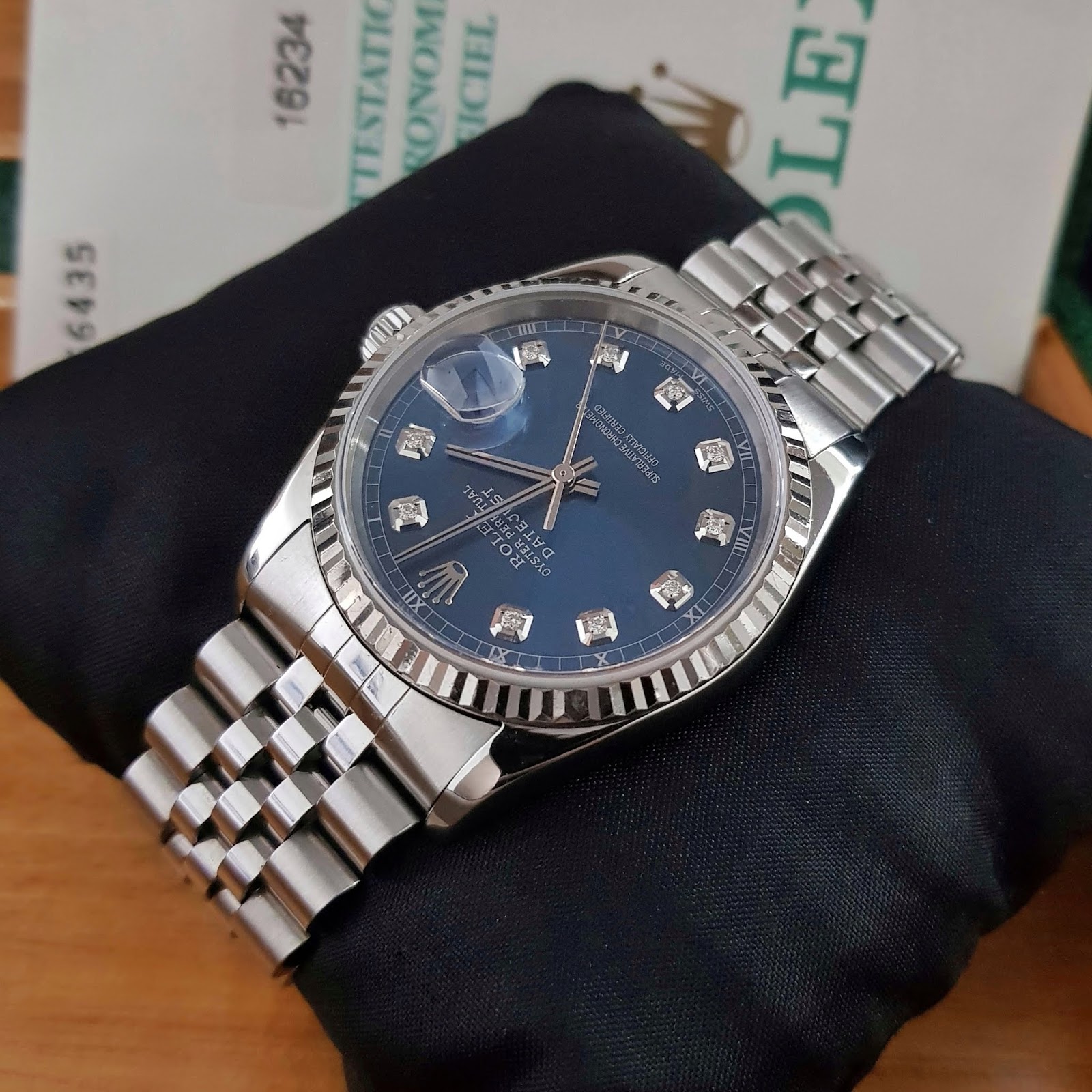 Watch Temptation Jual Beli Jam Tangan Second Arloji Mewah Bekas Original Sold Preowned Rolex Oyster Perpetual Datejust 16234 Blue Sunburst With Diamond Index Dial Steel And White Gold Fluted Bezel