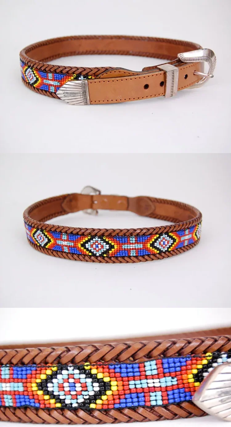 Koyu kahverengi el yapımı taşlı deri kemer.