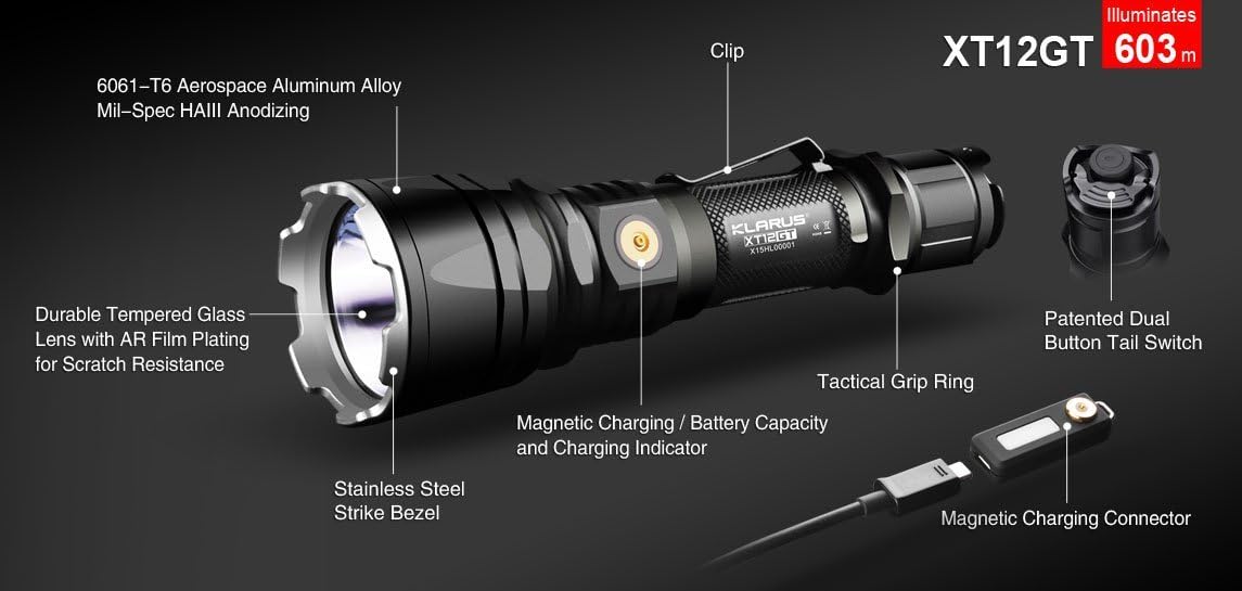 Amazon Com Klarus Xt12gt Cree Xhp35 Hi D4 Led Tactical Rechargeable Flashlight With Magnetic Usb Charging Connector Sports Outdoors