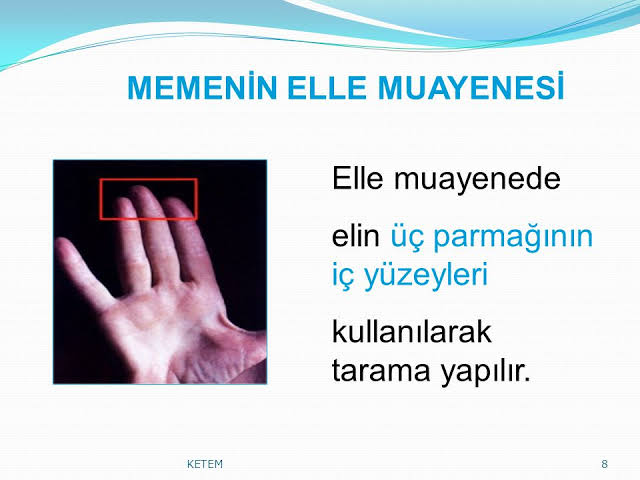 İki meme arasında asimetri. Her kadın kendini ayda bir kez muayene etmeli. Düz bir yatağa uzanılır. 3 memelerin palpasyonu elle muayene meme palpasyonu hasta sırtüstü yatarken yapılır.