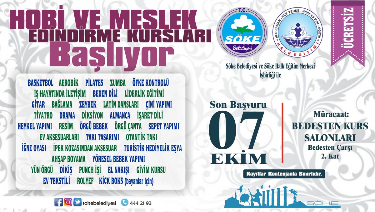 Soke Belediyesi On Twitter Soke Belediyesi Ve Soke Halk Egitim Merkezi Isbirligi Ile Duzenlenen Hobi Ve Meslek Edinme Kurslari Basliyor Son Basvuru 7 Ekim Muracaat Bedesten Carsi 2 Kata Yapilacaktir Kayitlar Kontenjanla